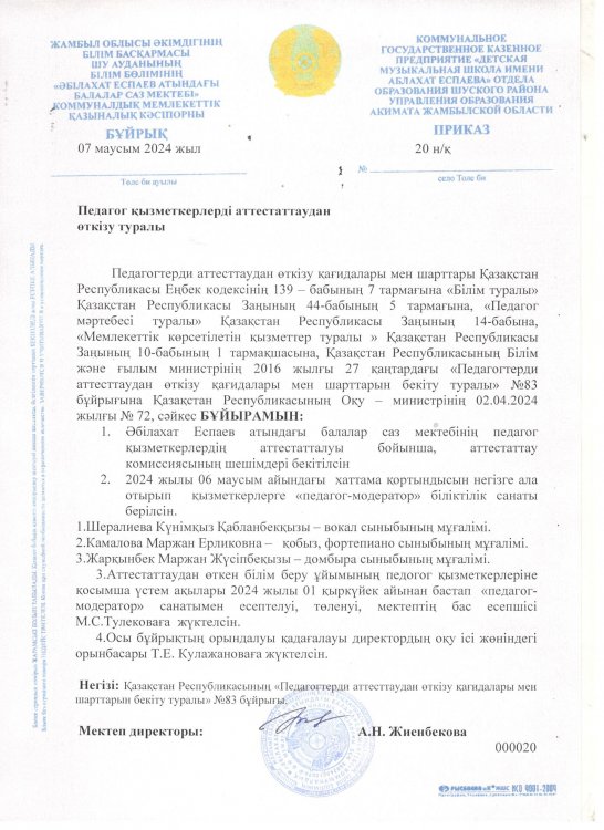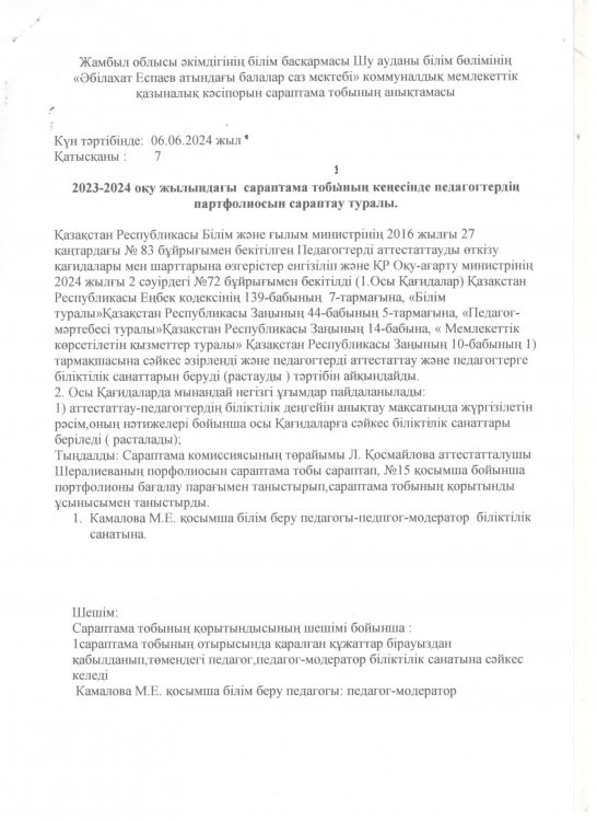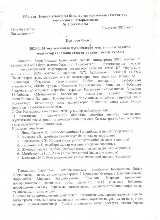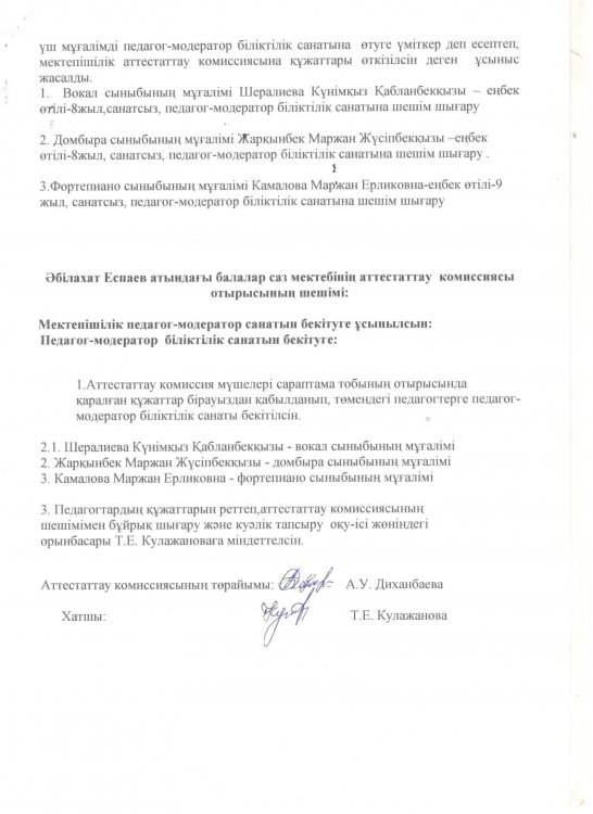Әбілахат Еспаев атындағы балалар саз мектебінің педагог-қызметкерлерінің аттестатталуы бойынша 2024 жылы 06 маусым айындағы хаттама қорытындысын негізге ала отырып, төмендегі тізім бойынша қызметкерлерге "педагог-модератор" біліктілік санаты берілді.