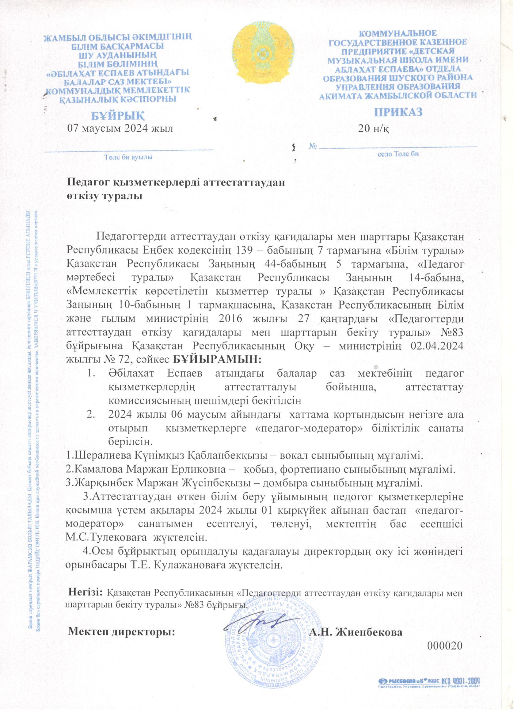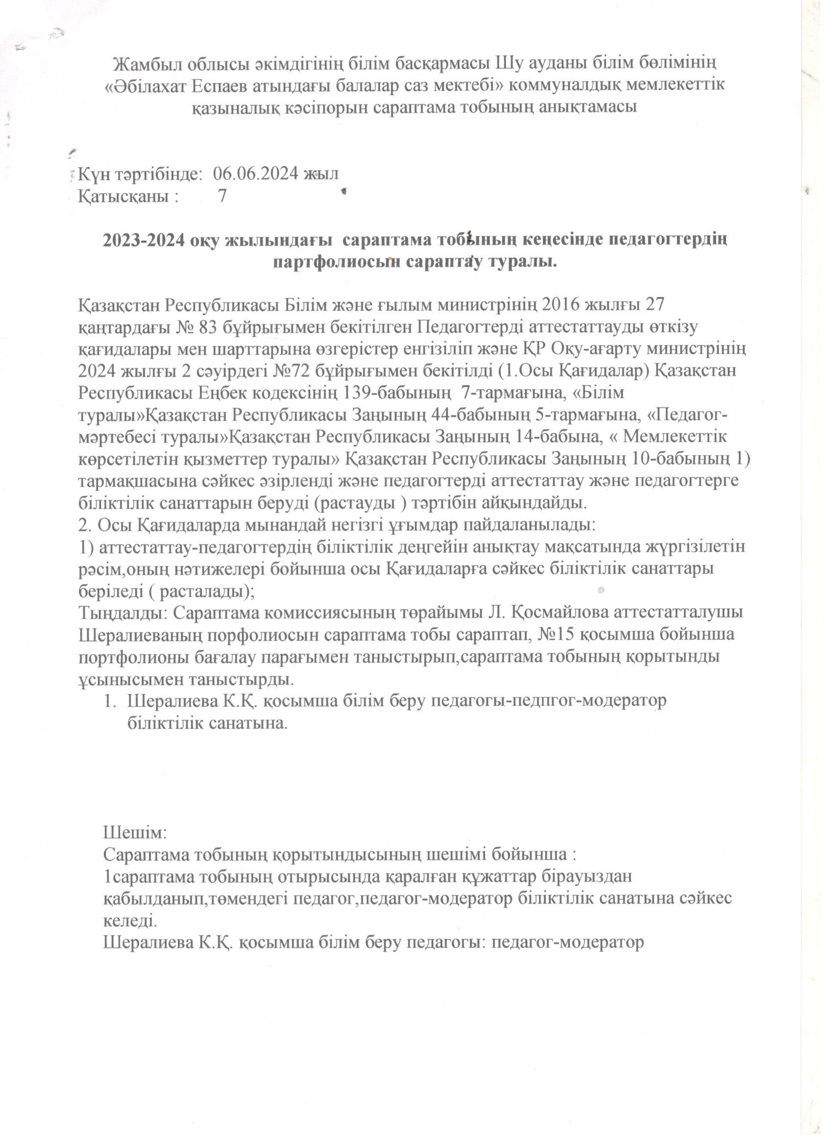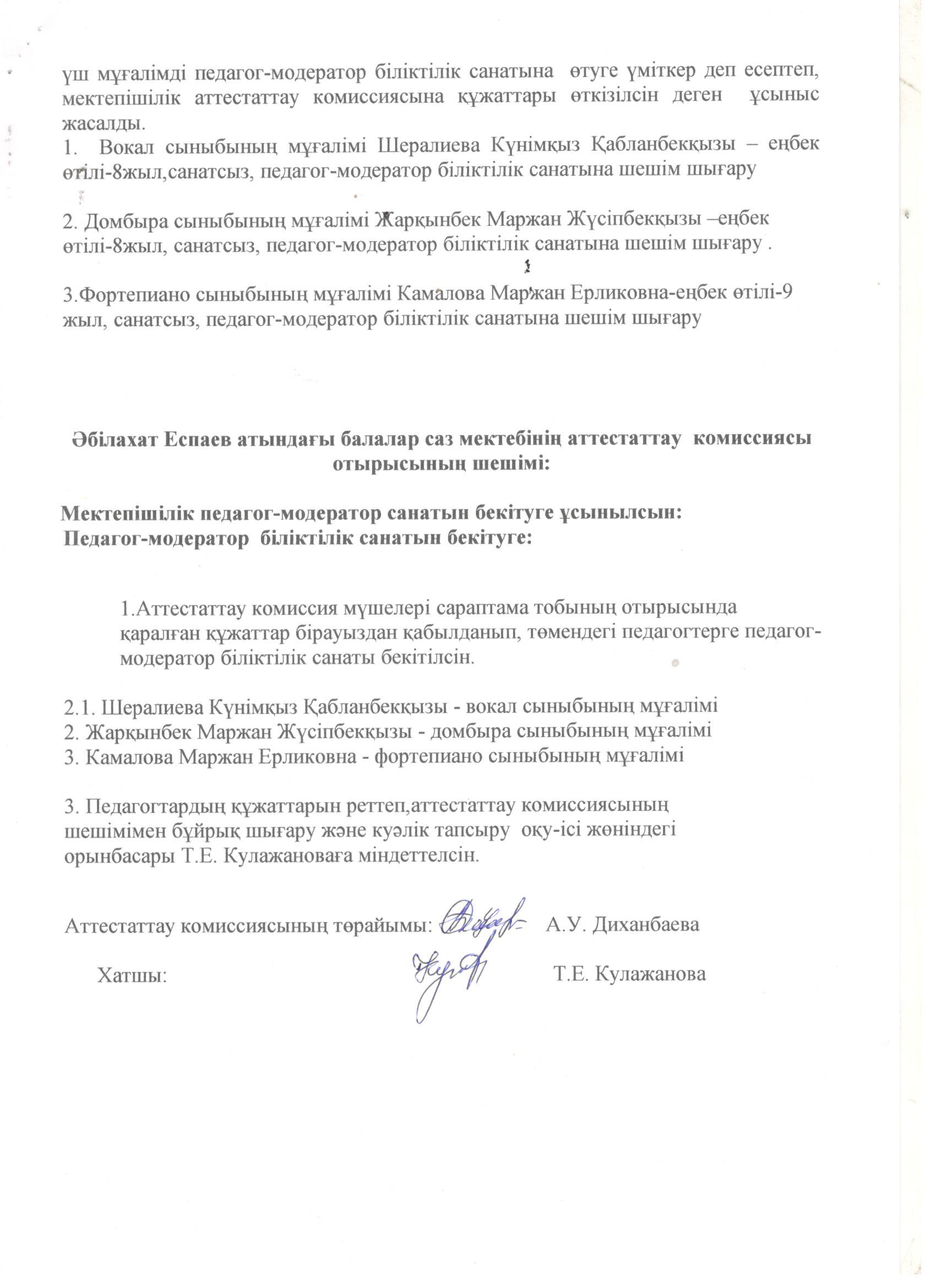Әбілахат Еспаев атындағы балалар саз мектебінің педагог-қызметкерлерінің аттестатталуы бойынша 2024 жылы 06 маусым айындағы хаттама қорытындысын негізге ала отырып, төмендегі тізім бойынша қызметкерлерге "педагог-модератор" біліктілік санаты берілді.