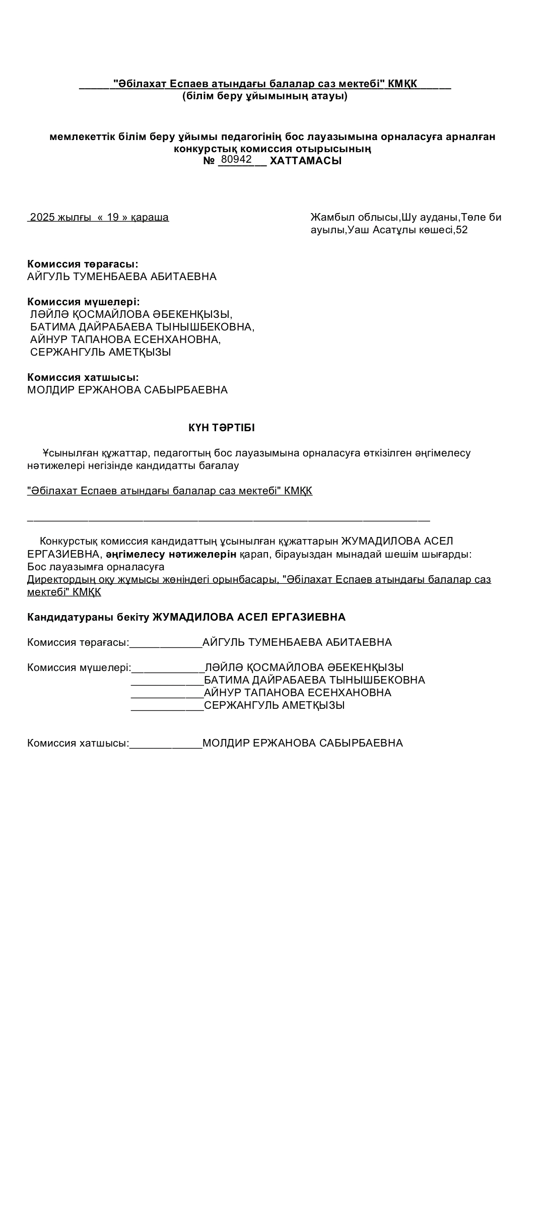2025 оқу жылының 20-қараша күні ДИРЕКТОРДЫҢ ОҚУ ІСІ ЖӨНІНДЕГІ ОРЫНБАСАРЫ лауазымдық қызметіне ЖУМАДИЛОВА АСЕЛЬ ЕРГАЗИЕВНА тағайындалды.